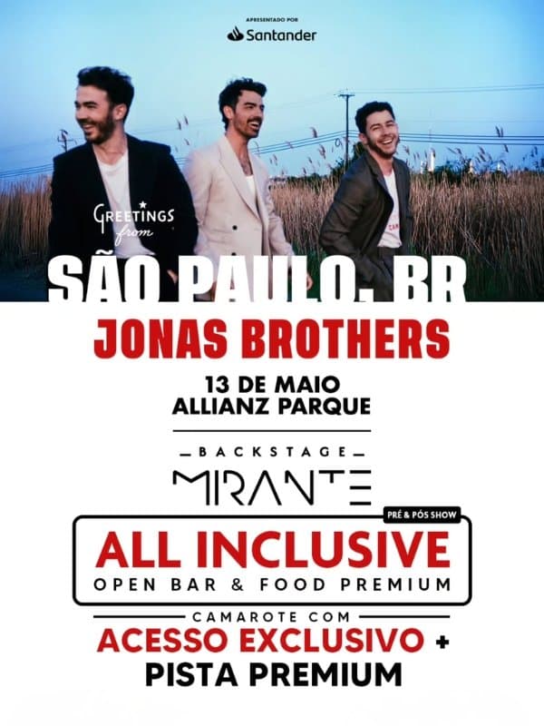 13 de maio os Jonas Brothers estão de volta ao Brasil para um reencontro especial com os fãs no Allianz Parque. O show reúne uma sequência de hits que marcaram e continuam marcando uma geração inteira ao redor do mundo. Para quem busca uma experiência ainda mais completa, o Backstage Mirante transforma a noite com um atendimento diferenciado do começo ao fim.