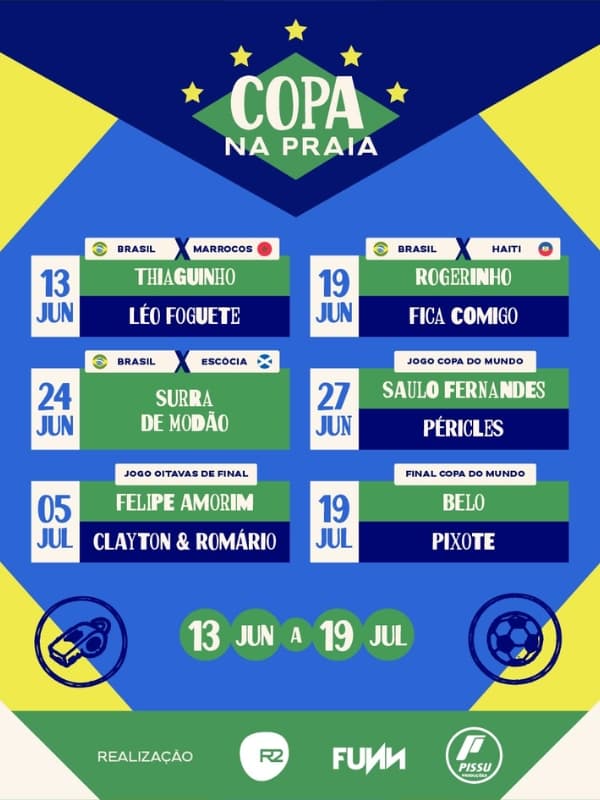 Durante o período da Copa, o festival ganha ainda mais força com o Copa Na Praia, transformando os dias de jogos em um ponto de encontro certo para quem quer viver a experiência com intensidade, música e torcida.