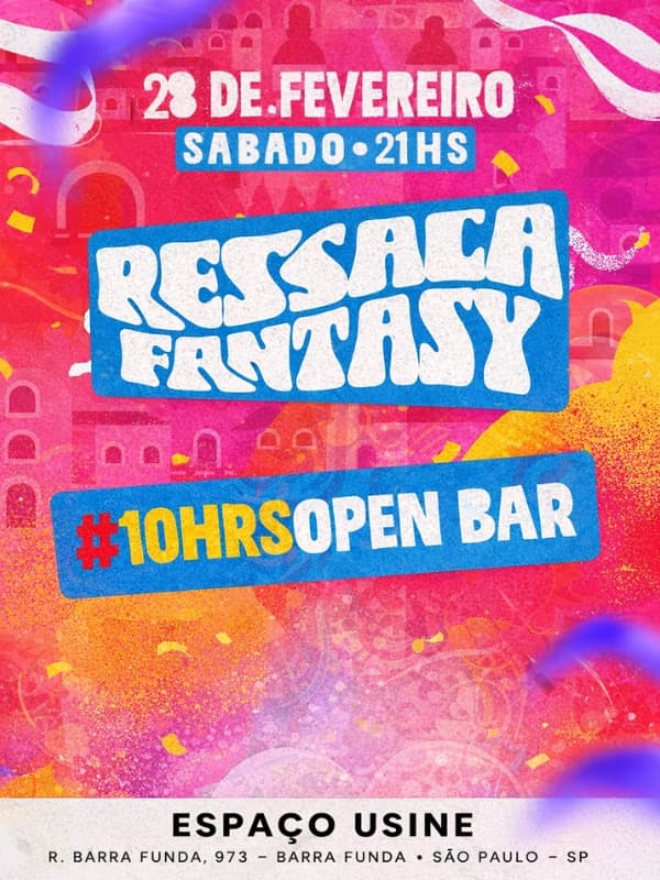 Ressaca Fantasy 2026 transforma o pós-Carnaval em uma noite à fantasia com 10 horas ininterruptas de open bar, muita música e energia do começo ao fim.