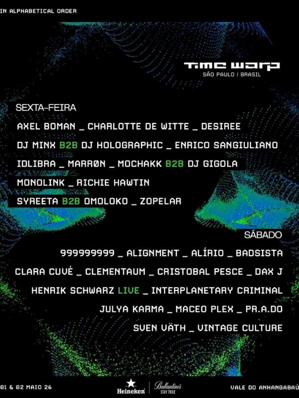 A marca Time Warp nasceu na Alemanha em 1994, com foco em Techno, House e suas vertentes, tornando-se rapidamente um dos festivais underground mais respeitados do mundo. No Brasil, a produção da Entourage Conteúdo Artístico tem consolidado o evento desde 2018, reunindo uma comunidade fiel e apaixonada pela cena. Em 1 e 2 de maio de 2026, o Time Warp retorna ao país para um final de semana intenso, com atmosfera única, energia de pista e a essência que transformou o festival em referência global. Preparado para viver isso?